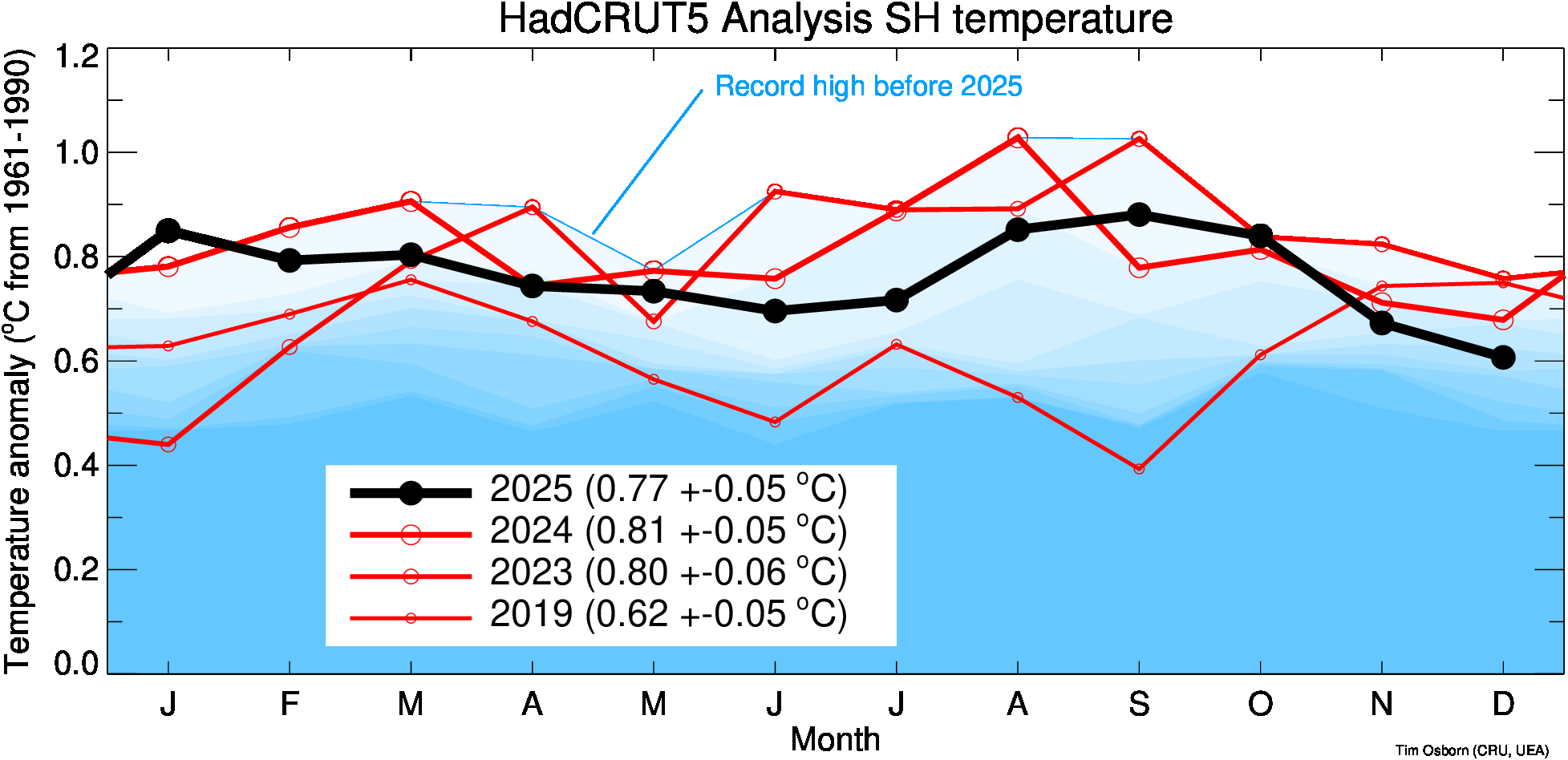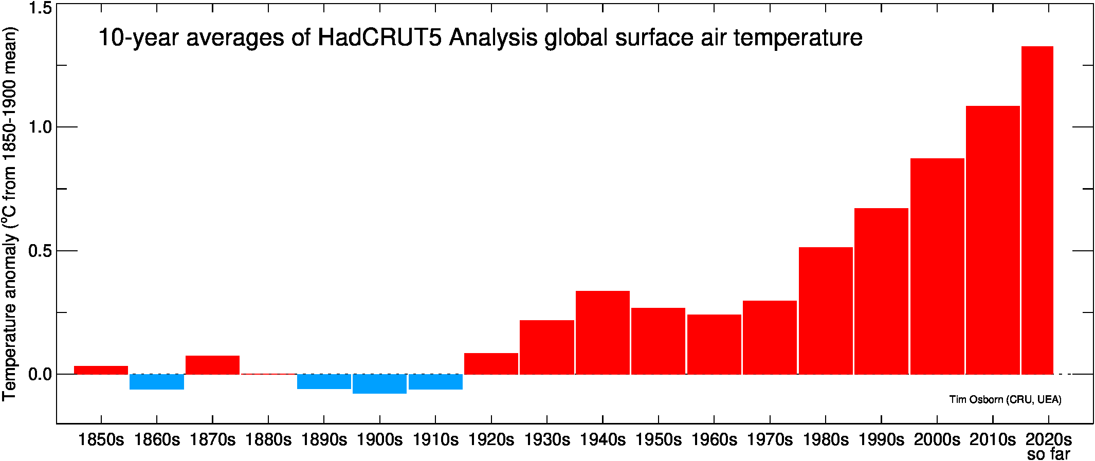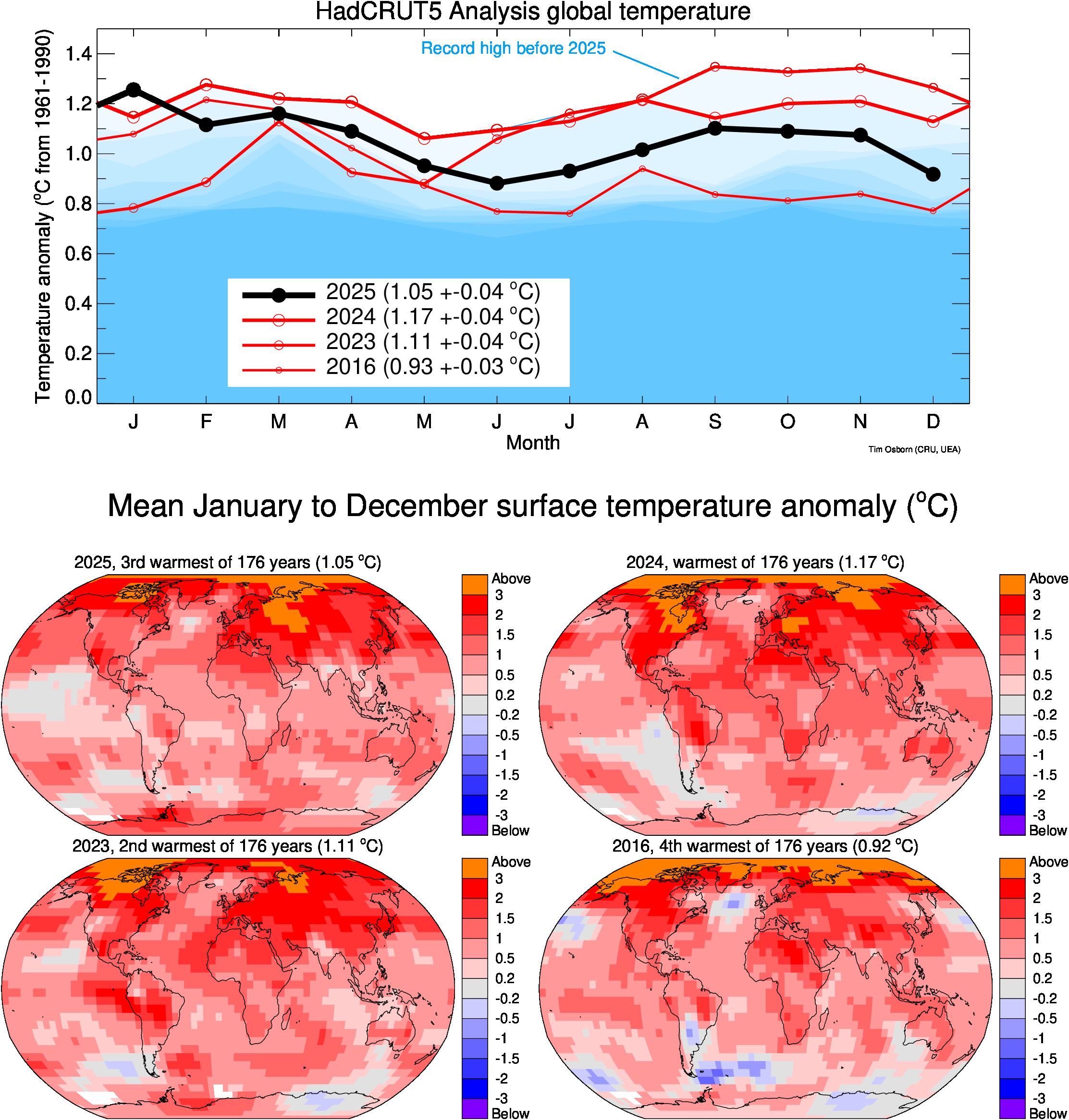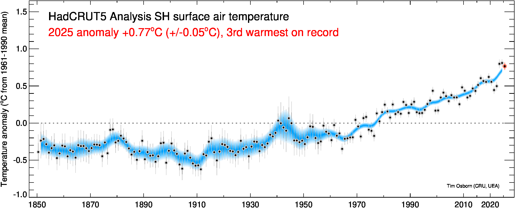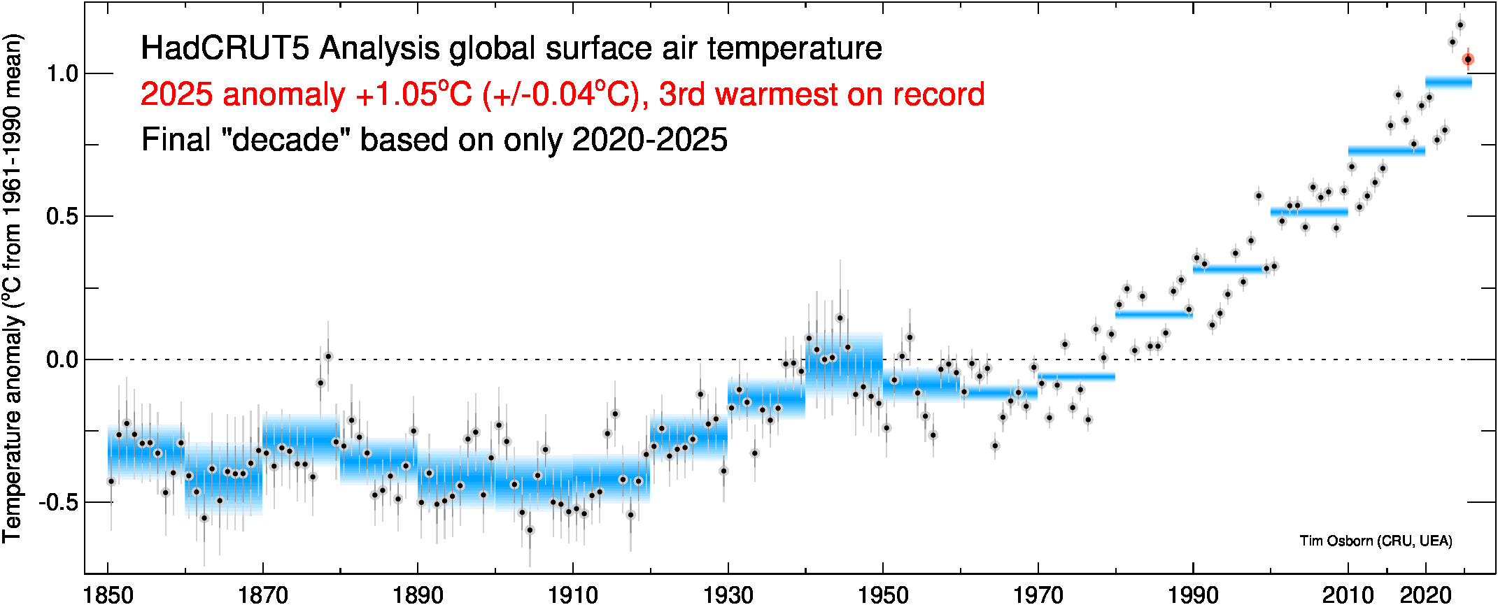 This page contains some visualisations of global and hemispheric temperatures. The temperature dataset used is our HadCRUT5 data (land and marine), or our CRUTEM5 data (land only). Some archived end-of-year graphs are based on the earlier (now superseded) versions. Click the "more info" links for details about each visualisation, or click the images to obtain a larger image. You are free to use these images provided you attribute them to Tim Osborn (CRU, UEA) and cite the HadCRUT5 or CRUTEM5 references listed below.