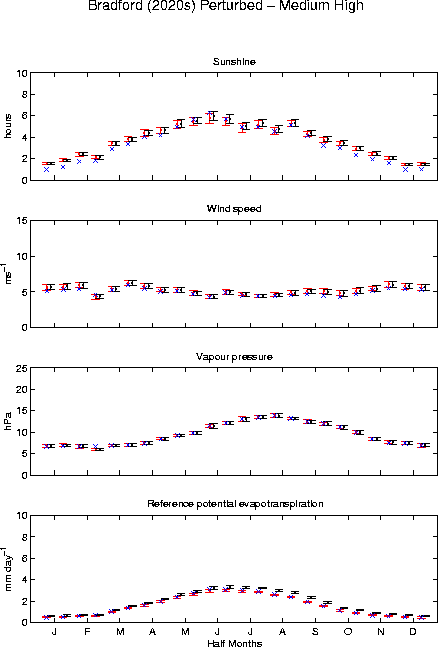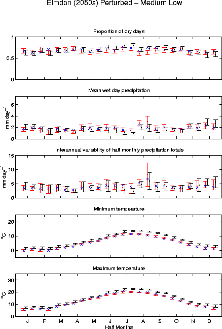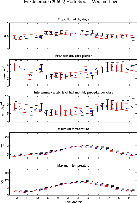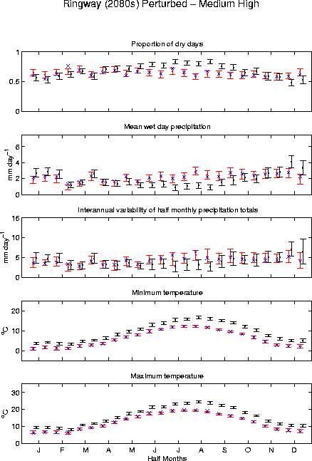In all figures, observed values (blue crosses) are the mean for the period shown in Table 2 of BETWIXT technical briefing note 1 (i.e., usually 1961-1990). The simulated values (red for the 1961-1990 control period and black for the scenario periods) are the mean of 100 30-year weather generator runs (red/black dots). The red/black lines and bars show the variability of the 100 series (plotted as plus/minus two standard deviations around the mean).