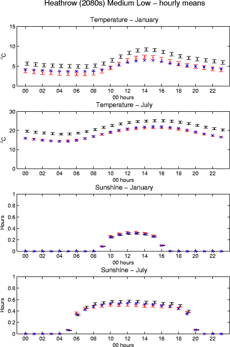In all figures, observed values (blue crosses) are the observed mean. The simulated values (red for the 1961-1990 control period and black for the scenario periods) are the mean of 50 30-year weather generator runs (red/black dots). The red/black lines and bars show the variability of the 50 series (plotted as plus/minus two standard deviations around the mean).