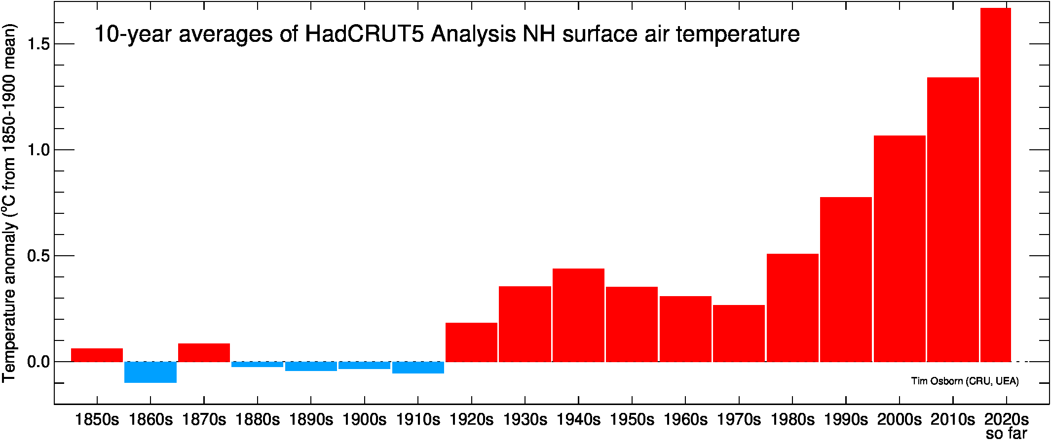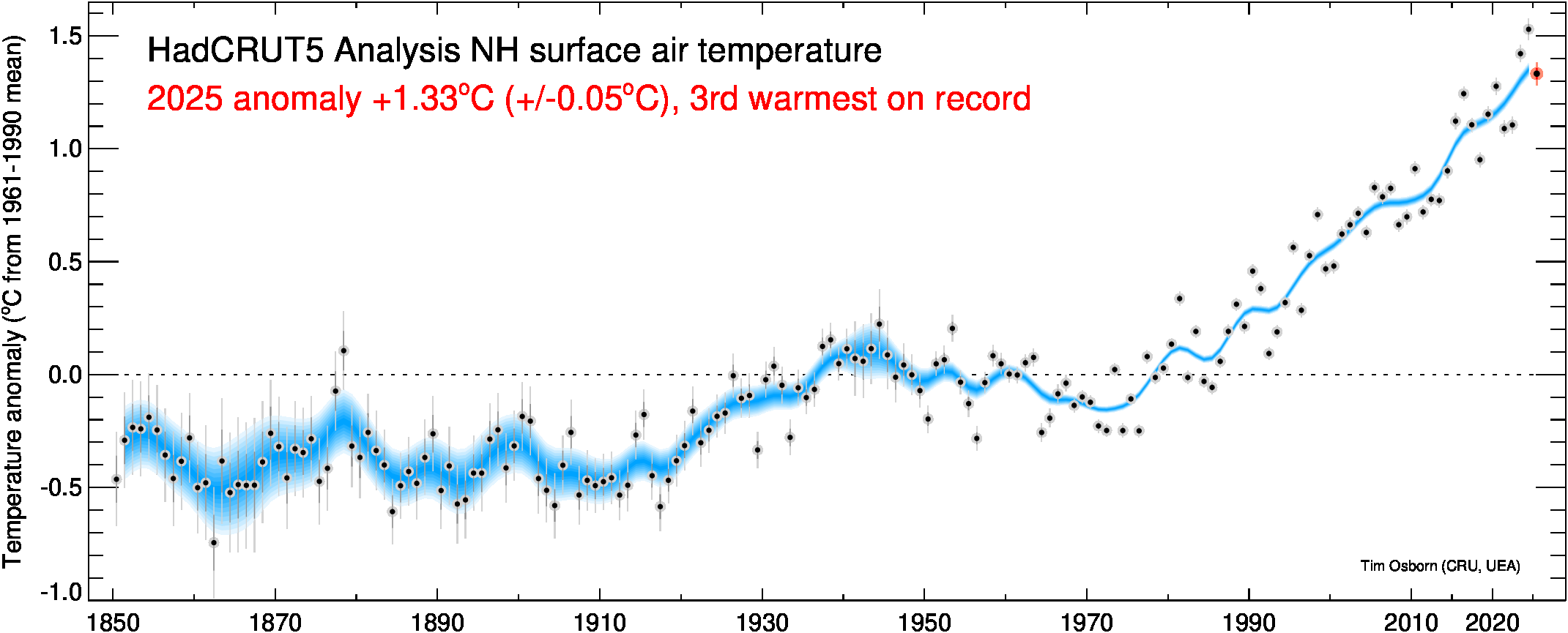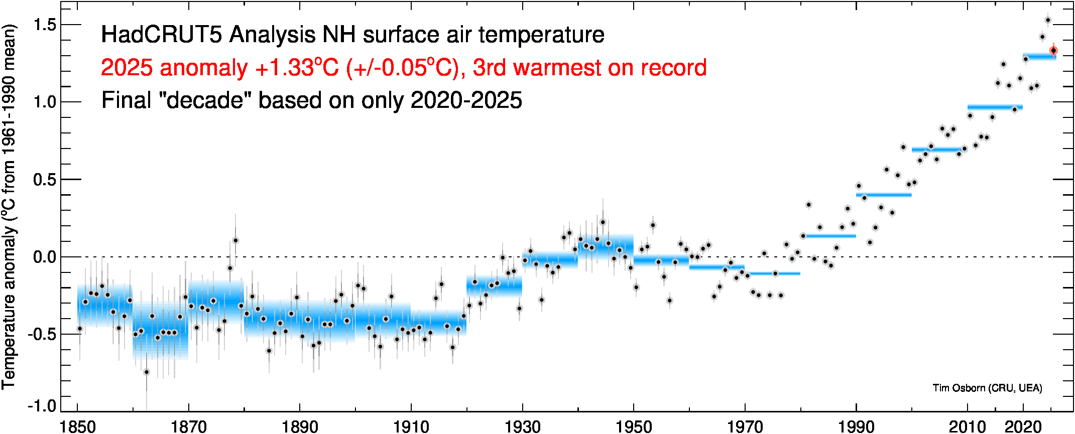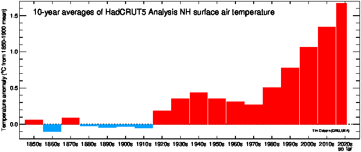 This page contains some visualisations of global and hemispheric temperatures. The temperature dataset used is our HadCRUT5 data (land and marine), or our CRUTEM5 data (land only). Some archived end-of-year graphs are based on the earlier (now superseded) versions. Click the "more info" links for details about each visualisation, or click the images to obtain a larger image. You are free to use these images provided you attribute them to Tim Osborn (CRU, UEA) and cite the HadCRUT5 or CRUTEM5 references listed below.