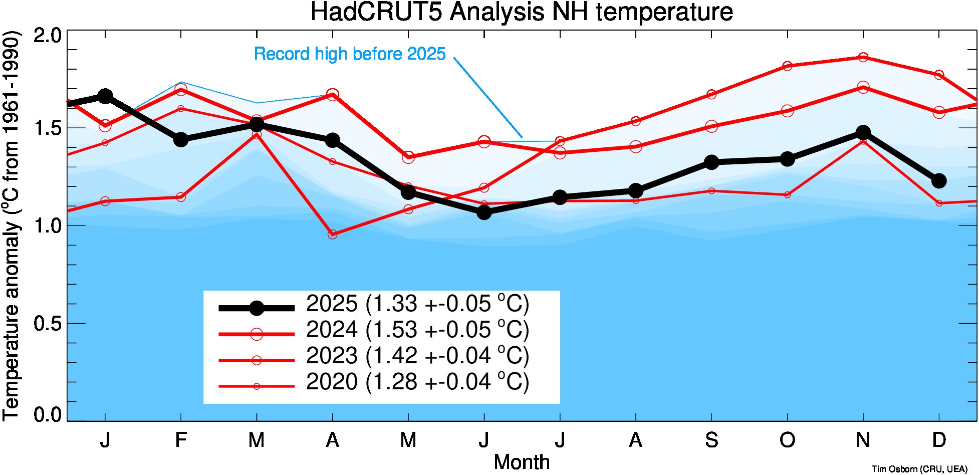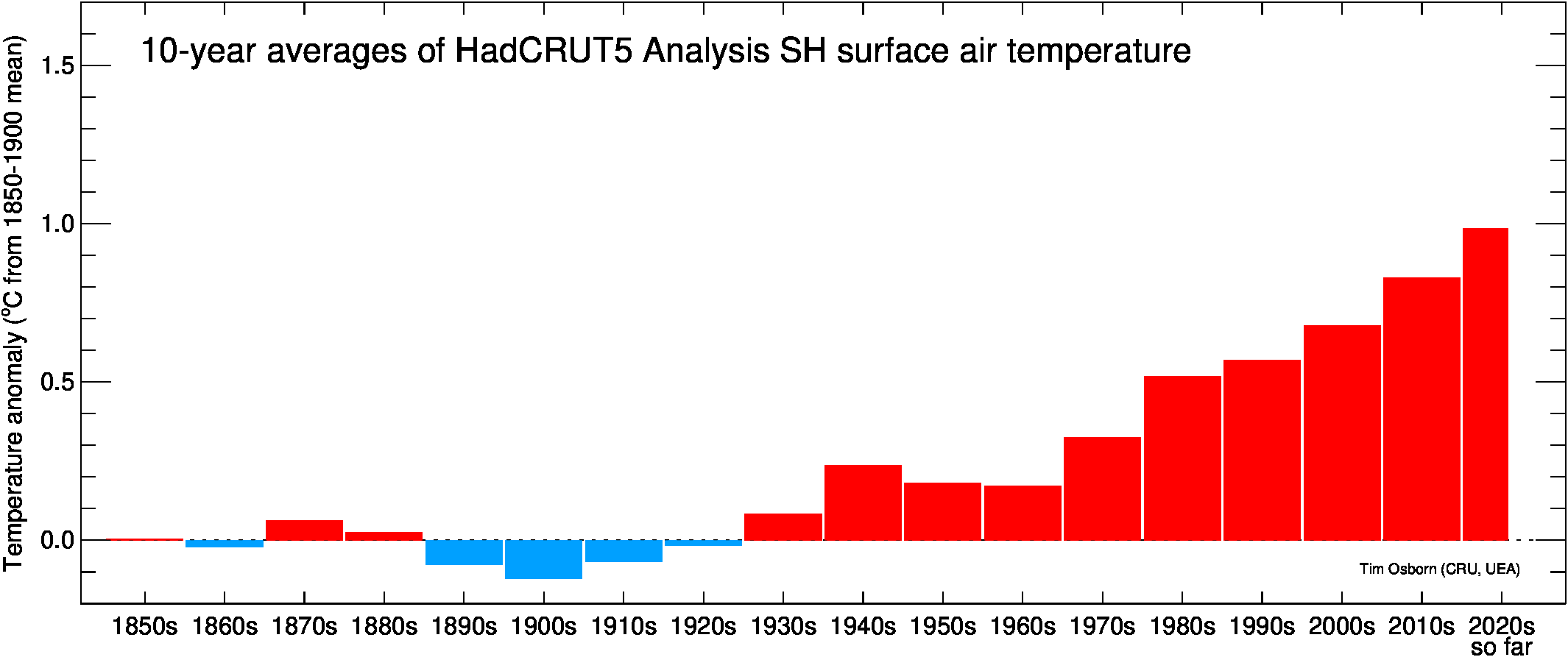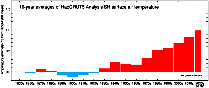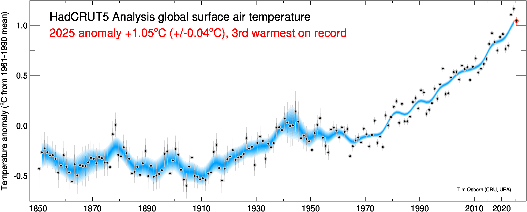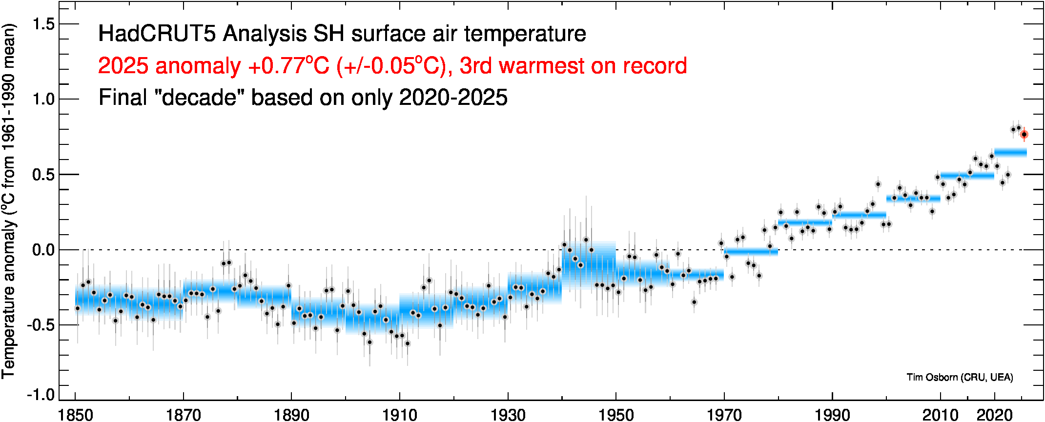 This page contains some visualisations of global and hemispheric temperatures. The temperature dataset used is our HadCRUT5 data (land and marine), or our CRUTEM5 data (land only). Some archived end-of-year graphs are based on the earlier (now superseded) versions. Click the "more info" links for details about each visualisation, or click the images to obtain a larger image. You are free to use these images provided you attribute them to Tim Osborn (CRU, UEA) and cite the HadCRUT5 or CRUTEM5 references listed below.